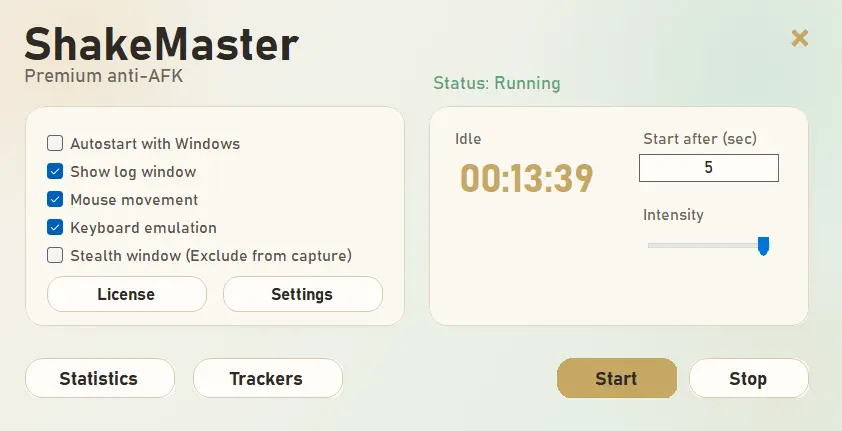 ShakeMaster simulates human-like motion and quiet keyboard activity to keep Hubstaff, TimeDoctor, and other trackers active while you work or step away.